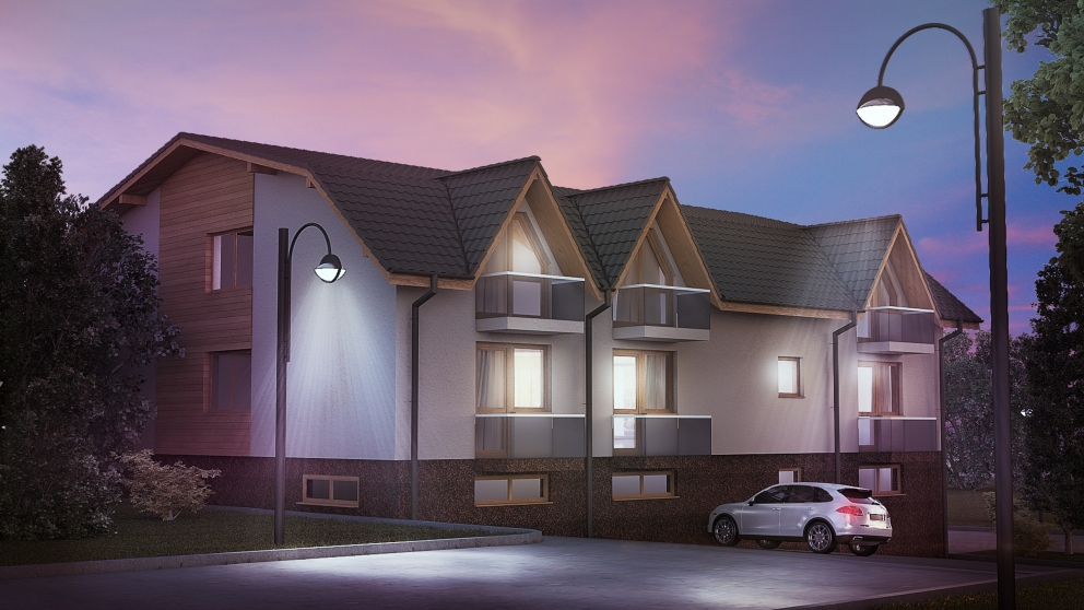 BYTOVÝ DOM BOL NAVRHNUTÝ AKO ZMENA STAVBY RODINNÉHO DOMU NA OSEM BYTOVÝCH JEDNOTIEK. TROJPODLAŽNÝ OBJEKT JE ZASTREŠENÝ MANZARDOVOU STRECHOU, KTORÁ JE DOPLNENÁ SEDLOVÝMI VYKIERMI PO OBOCH STRANÁCH. NA PRVOM PODLAŽÍ SÚ UMIESTNENÉ GARÁŽE, TECHNICKÁ MIESTNOSŤ A PIVNIČNÉ KOBKY. NA ĎALŠÍCH DVOCH PODLAŽIACH SÚ UMIESTNENÉ BYTY.