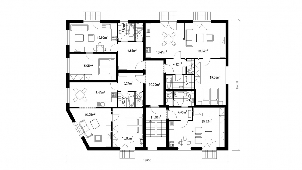 NA JEDNOM TYPICKOM PODLAŽÍ SÚ UMIESTNENÉ TRI DVOJIZBOVÉ A JEDEN JEDNOIZBOVÝ BYT. ZÁKLADOVÉ PÁSY EXISTUJÚCEJ STAVBY BOLI ZOSILNENÉ NA POŽADOVANÝ ROZMER. MUROVANÁ STAVBA MÁ MEDZI JEDNOTLIVÝMI PODLAŽIAMI ŽELEZOBETÓNOVÉ STROPY A SCHODISKO. DREVENÝ KROV POSKYTUJE VĎAKA SVOJMU ŠPECIFICKÉMU TVARU NADŠTANDARDNÉ PRIESTORY V OBYTNOM PODKROVÍ. KAŽDÝ BYT MÁ SAMOSTATNÝ BALKÓN.