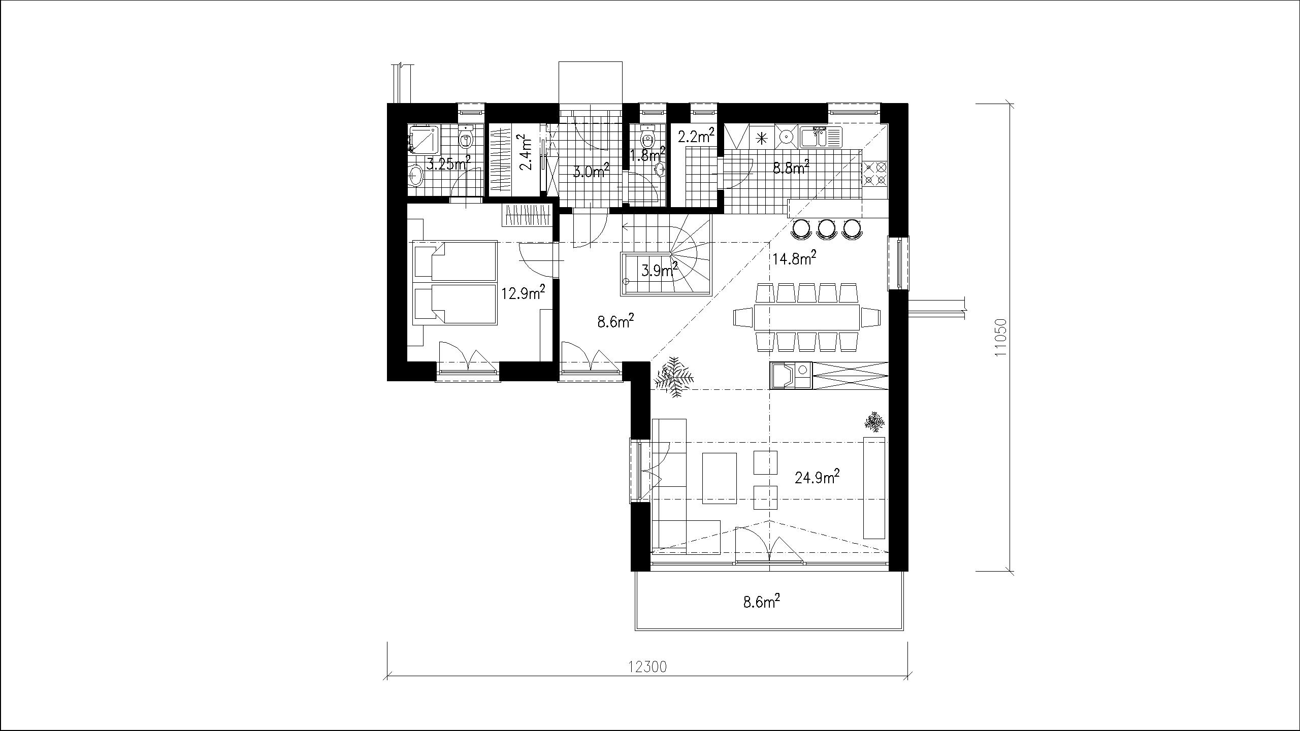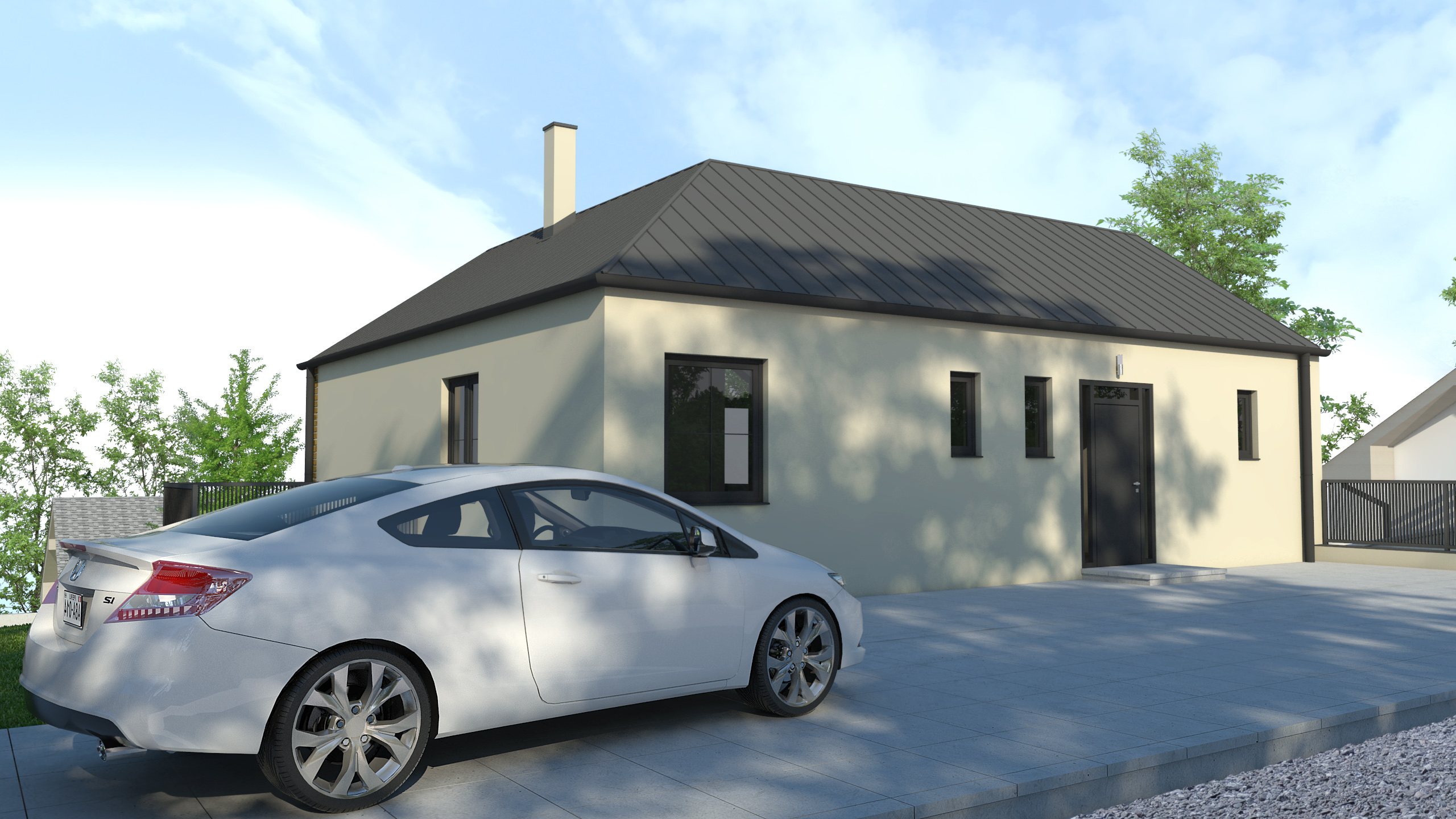 VZHĽADOM NA POŽIADAVKY RODINNÉHO BÝVANIA A NETYPICKÚ ORIENTÁCIU VJAZDU NA TERÉN JE NÁVRH ŠPECIFICKÝ. ZA VJAZDOM NA PARCELU SÚ NAVRHNUTÉ TRI PARKOVACIA MIESTA S MOŽNOSŤOU OTÁČANIA VOZIDIEL NA POZEMKU. NA PRÍZEMÍ JE NAVRHNUTÁ HOSŤOVSKÁ IZBA, KUCHYŇA A OBÝVACIA IZBA S PRIZNANÝMI DREVENÝMI VÄZNÍKMI. PODZEMNÉ PODLAŽIE JE PRIAMO PRÍSTUPNÉ ZO ZÁHRADY. JE TU SITUOVANÁ SÚKROMNÁ ČASŤ SO SPÁLŇOU, KÚPEĽŇOU A DETSKÝMI IZBAMI A TECHNICKÁ MIESTNOSŤ.