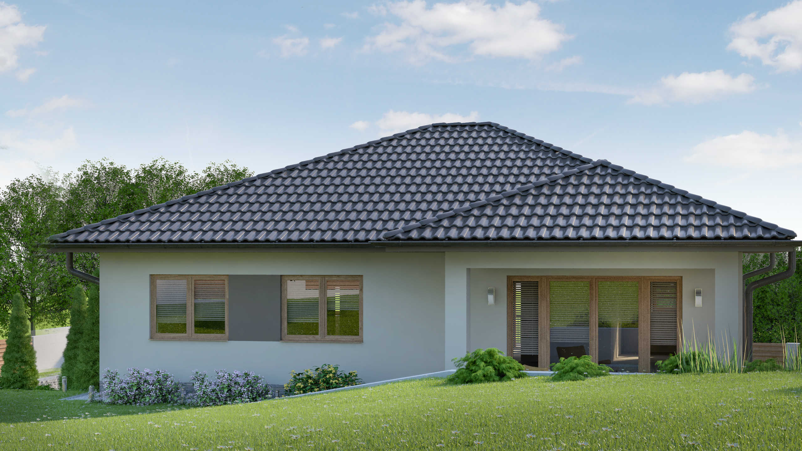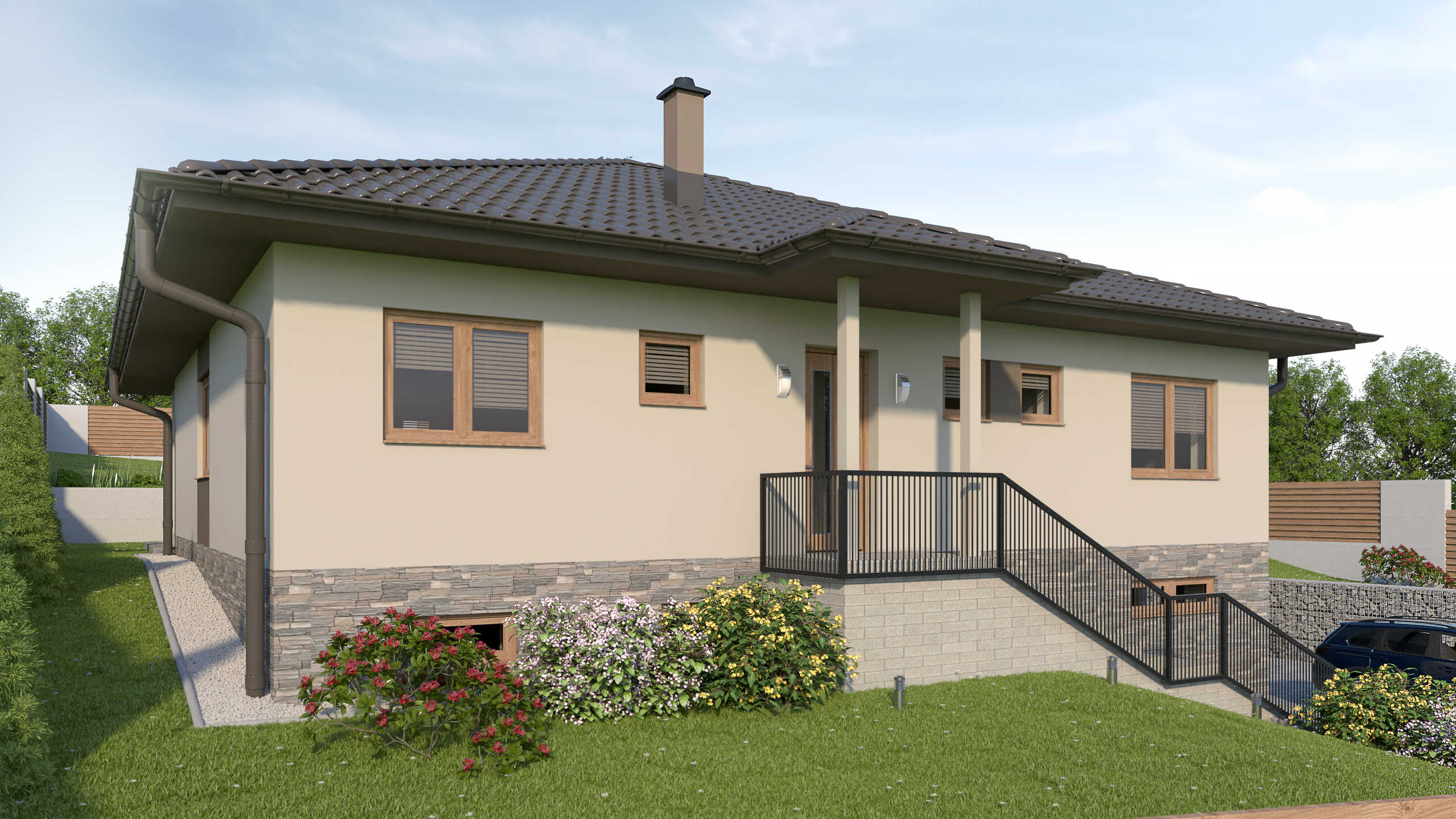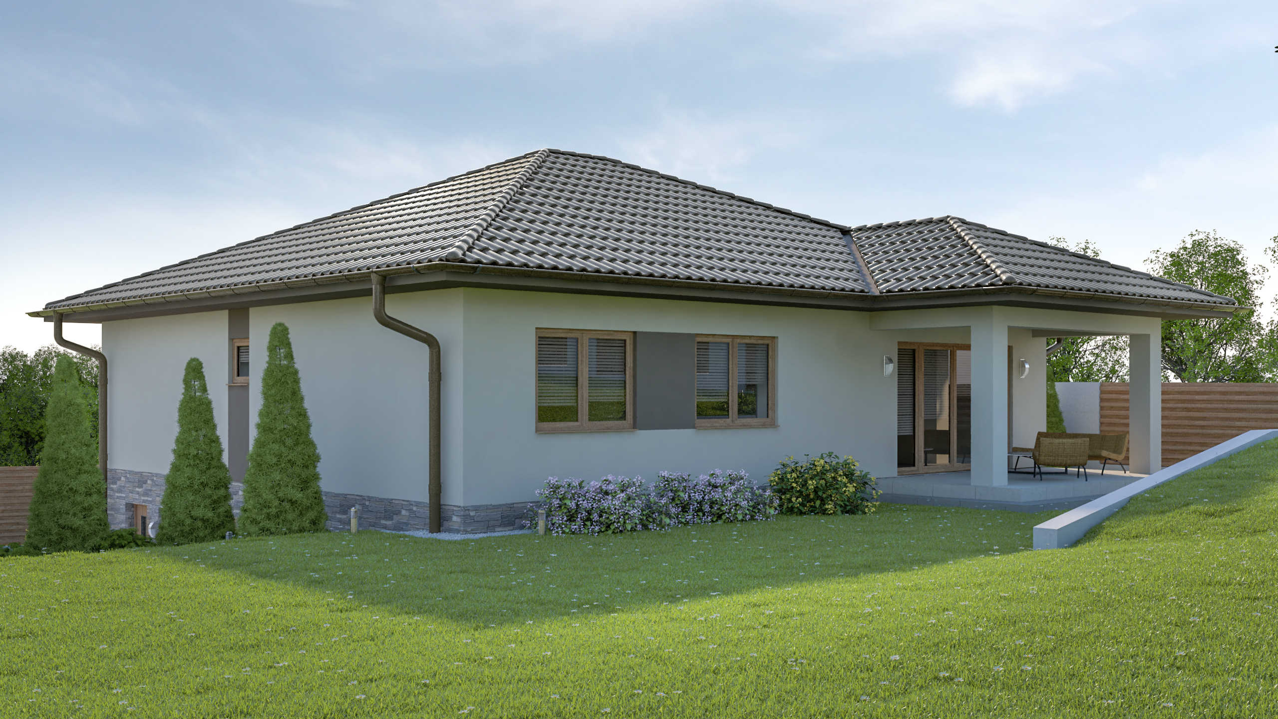 JEDNOPODLAŽNÁ STAVBA SO SUTERÉNOM JE NAVRHOVANÁ PRE 4-ČLENNÚ RODINU. SRDCOM TOHTO DOMU JE PRIESTRANNÁ A PRESVETLENÁ OBÝVACIA IZBA SPOJENÁ S TERASOU A OKOLITOU PRÍRODOU. PRÍZEMIE S HLAVNÝM VSTUPOM JE TIEŽ TVORENÉ KUCHYŇOU S JEDÁLŇOU, SÚKROMNOU ČASŤOU A HYGIENICKÝM ZÁZEMÍM. V SUTERÉNE JE SÚSTREDENÁ HOSPODÁRSKO-TECHNICKÁ ZÓNA S GARÁŽOU..