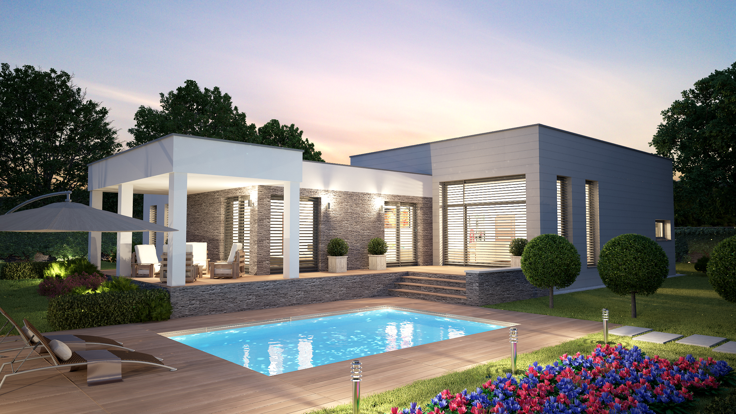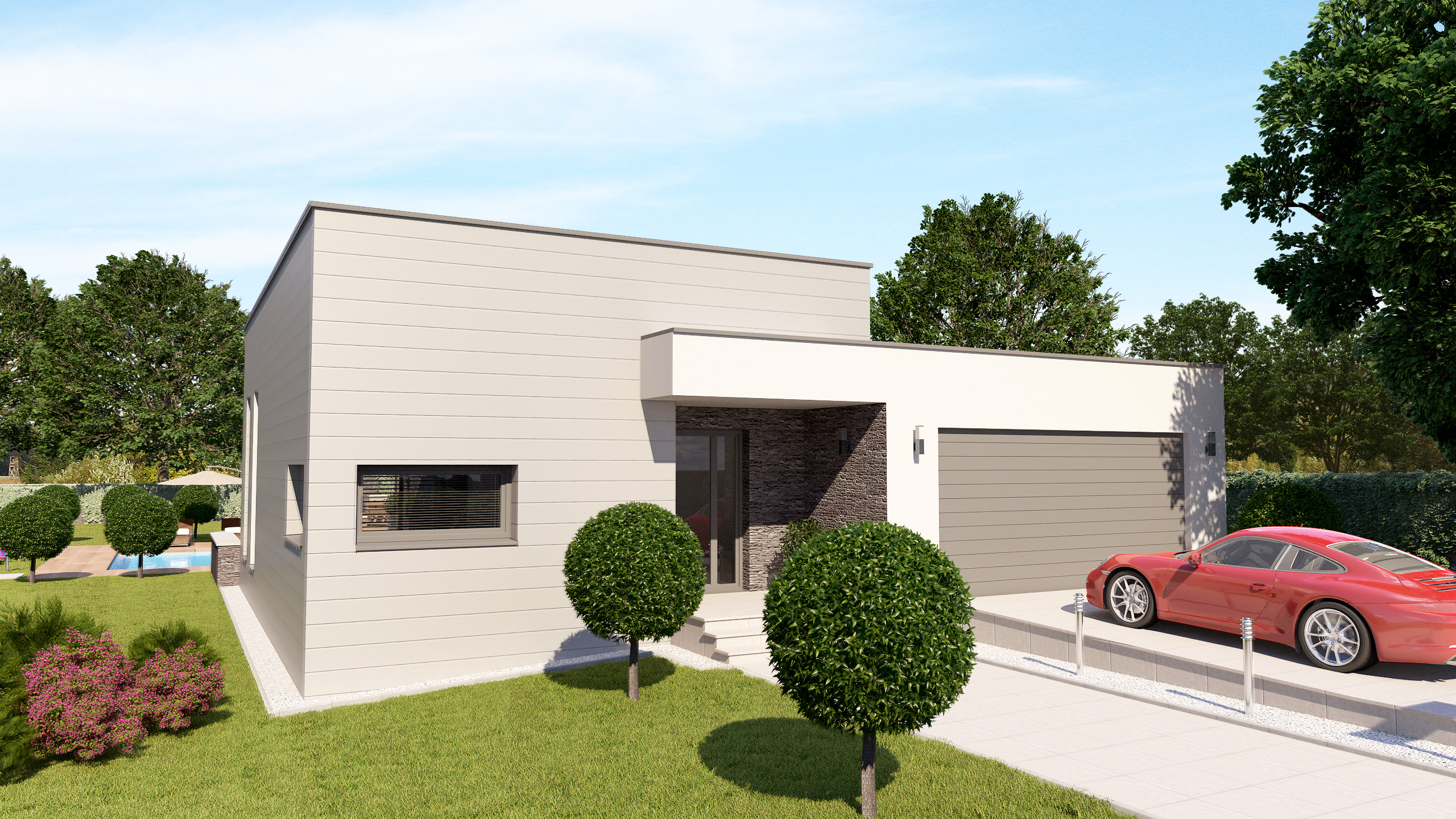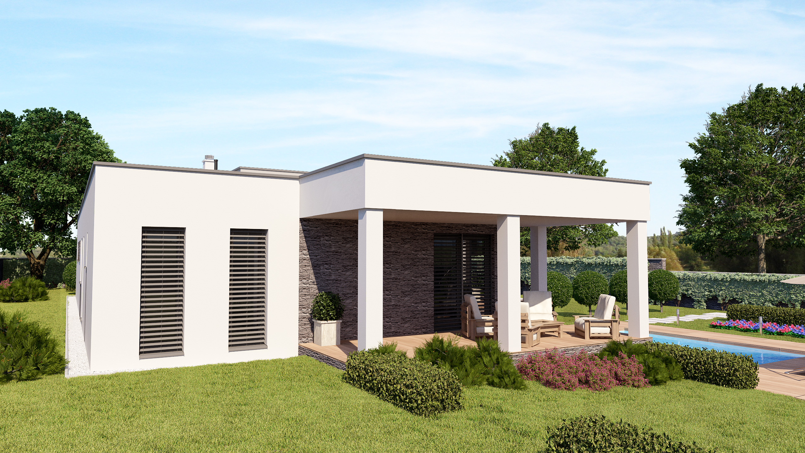 IDE O ROZĽAHLÝ RODINNÝ DOM, KTORÝ PONÚKA ŽIVÝ KONTAKT SO ZÁHRADOU. SÚČASŤOU NÁVRHU BOLA EXTERIÉROVÁ TERASA A VONKAJŠÍ BAZÉN. MODERNÝ VZHĽAD A NÍZKA VÝŠKA STAVBY PONÚKA OSADIŤ OBJEKT DO BEŽNEJ ZÁSTAVBY RODINNÝCH DOMOV.