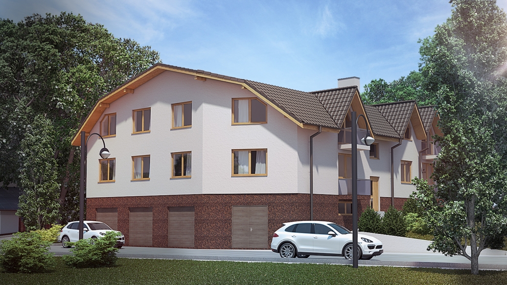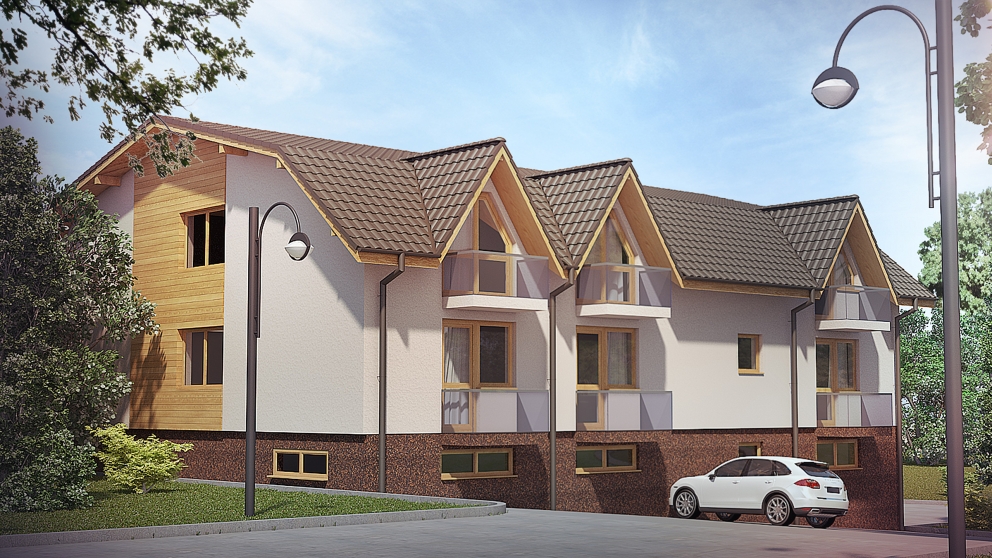 BYTOVÝ DOM BOL NAVRHNUTÝ AKO ZMENA STAVBY RODINNÉHO DOMU NA OSEM BYTOVÝCH JEDNOTIEK. TROJPODLAŽNÝ OBJEKT JE ZASTREŠENÝ MANZARDOVOU STRECHOU, KTORÁ JE DOPLNENÁ SEDLOVÝMI VYKIERMI PO OBOCH STRANÁCH. NA PRVOM PODLAŽÍ SÚ UMIESTNENÉ GARÁŽE, TECHNICKÁ MIESTNOSŤ A PIVNIČNÉ KOBKY. NA ĎALŠÍCH DVOCH PODLAŽIACH SÚ UMIESTNENÉ BYTY.