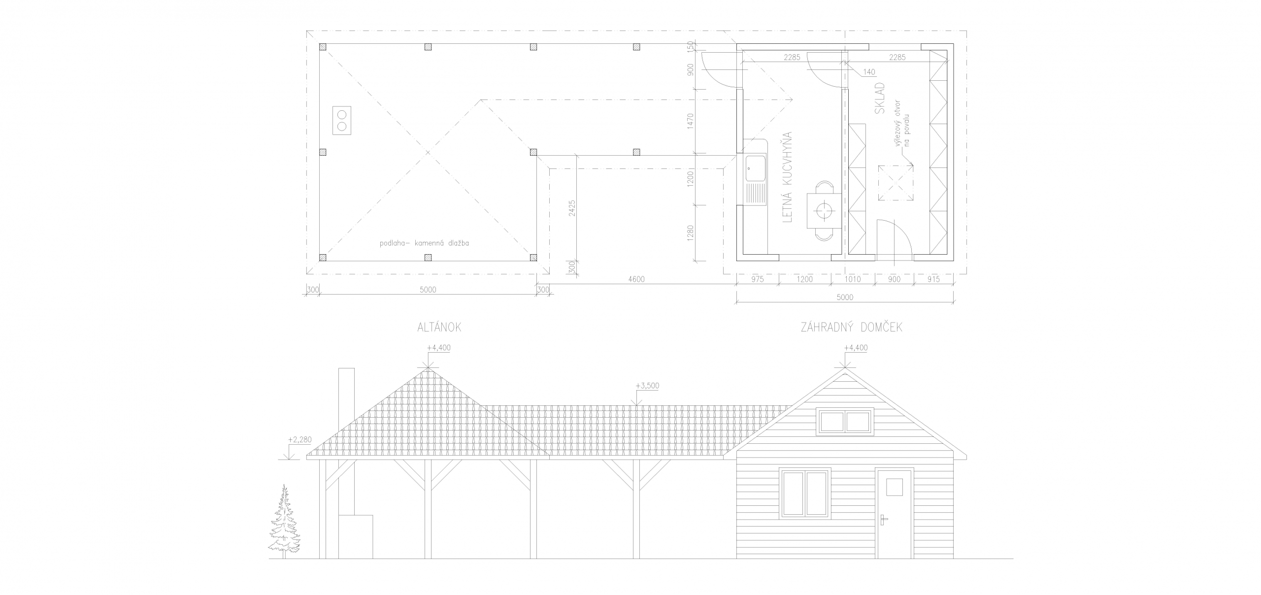 SAMOTNÝ DOMČEK SLÚŽI V LETNÝCH MESIACOCH AKO LETNÁ KUCHYŇA ALEBO AKO PRIESTOR PRE PRÍPRAVU RODINNÝCH STRETUTÍ NA ČERSTVOM VZDUCHU POD ALTÁNKOM. STAVBA JE NAVRHNUTÁ AKO DREVENÁ KONŠTRUKCIA OSADENÁ DO BETÓNOVÝCH ZÁKLADOV. PODKROVIE SLÚŽI AKO ODKLADACÍ PRIESTOR. ZÁHRADNÝ DOMČEK JE NAPOJENÝ NA VEREJNÝ VODOVOD, KANALIZÁCIU A ELEKTRICKÚ SIEŤ.