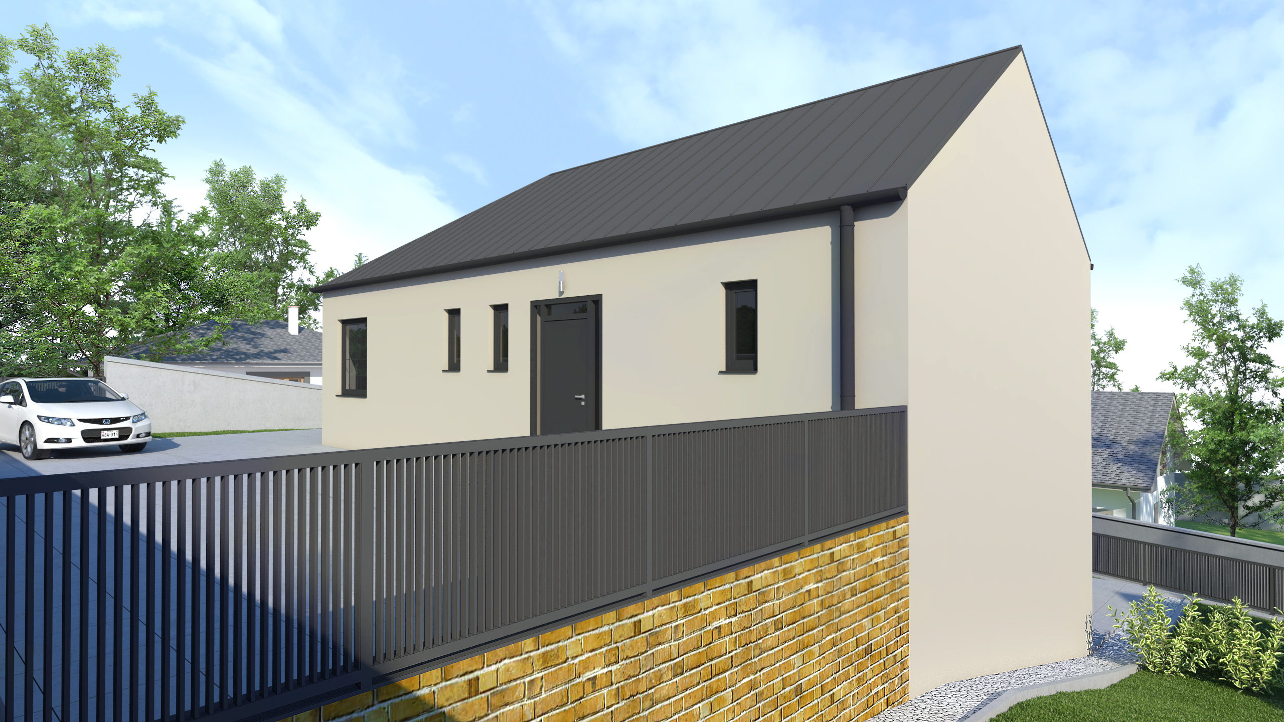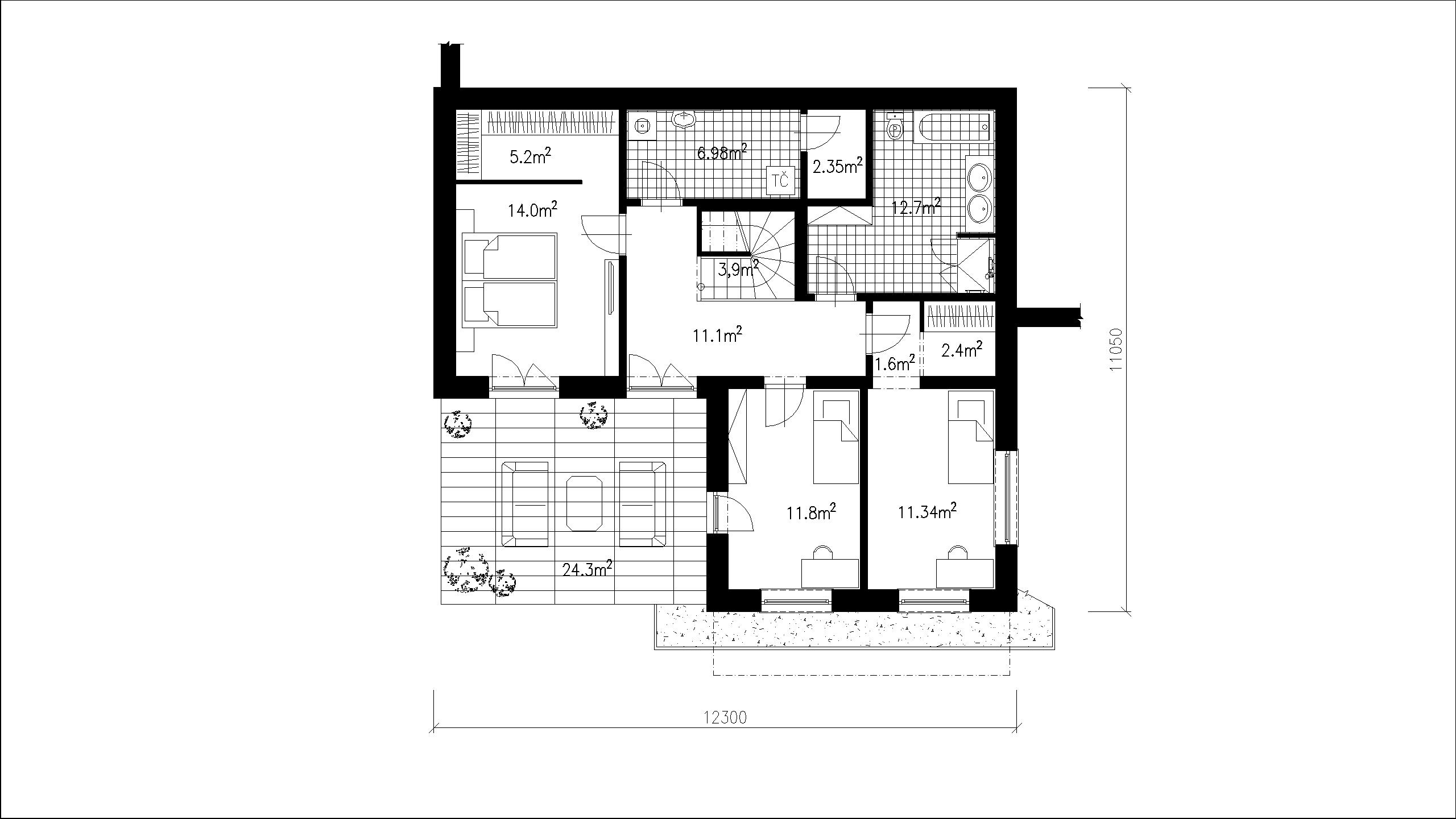 VZHĽADOM NA POŽIADAVKY RODINNÉHO BÝVANIA A NETYPICKÚ ORIENTÁCIU VJAZDU NA TERÉN JE NÁVRH ŠPECIFICKÝ. ZA VJAZDOM NA PARCELU SÚ NAVRHNUTÉ TRI PARKOVACIA MIESTA S MOŽNOSŤOU OTÁČANIA VOZIDIEL NA POZEMKU. NA PRÍZEMÍ JE NAVRHNUTÁ HOSŤOVSKÁ IZBA, KUCHYŇA A OBÝVACIA IZBA S PRIZNANÝMI DREVENÝMI VÄZNÍKMI. PODZEMNÉ PODLAŽIE JE PRIAMO PRÍSTUPNÉ ZO ZÁHRADY. JE TU SITUOVANÁ SÚKROMNÁ ČASŤ SO SPÁLŇOU, KÚPEĽŇOU A DETSKÝMI IZBAMI A TECHNICKÁ MIESTNOSŤ.