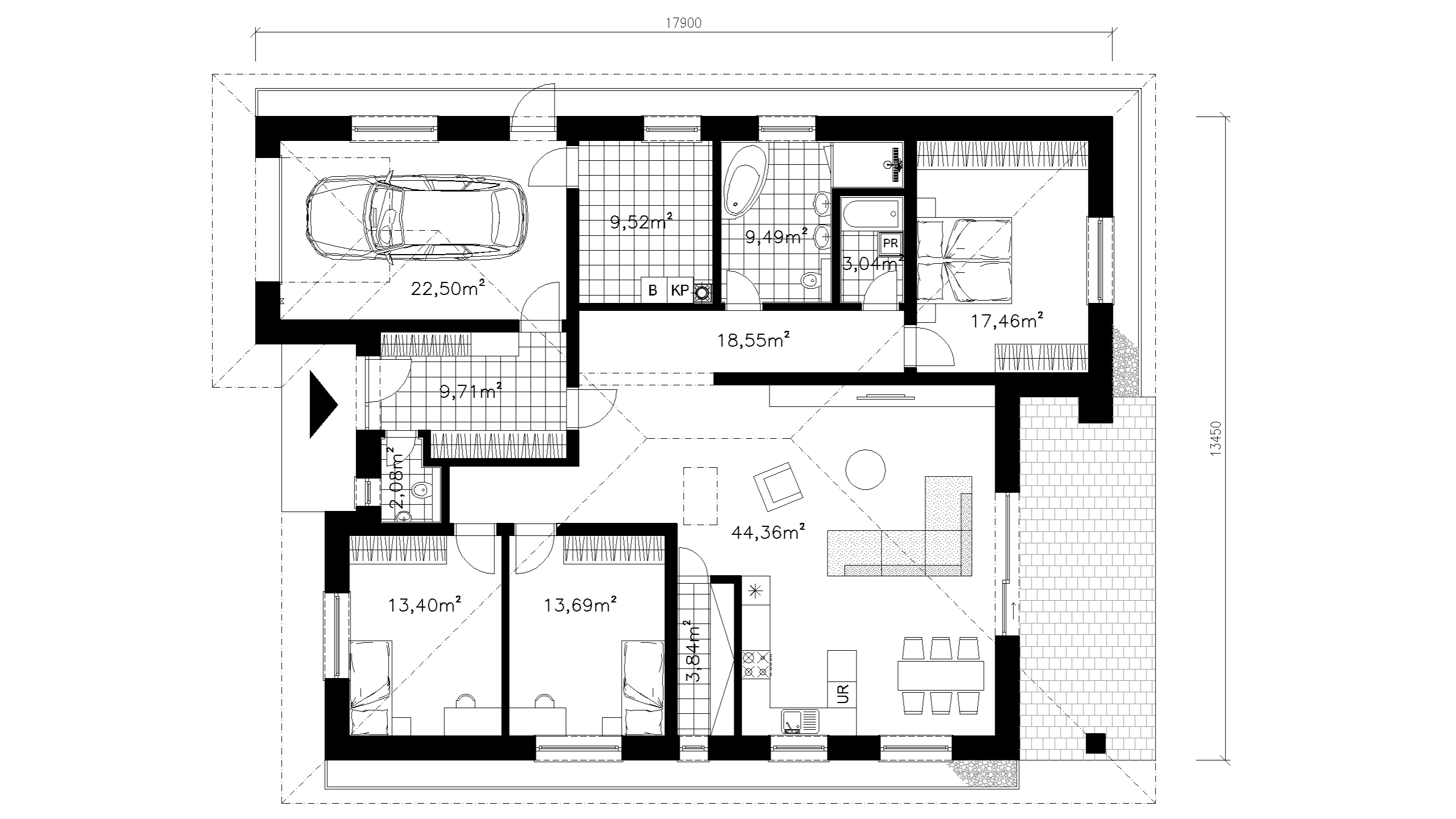 RODINNÝ DOM JE NAVRHNUTÝ AKO SAMOSTATNE STOJACA JEDNOPODLAŽNÁ STAVBA ZASTREŠENÁ VALBOVOU STRECHOU S KOMPAKTNÝM OBDĹŽNIKOVÝM PÔDORYSOM. CENTRÁLNU ČASŤ DISPOZÍCIE TVORÍ OBYTNÝ PRIESTOR S KUCHYŇOU A JEDÁLŇOU A PRIAMYM VÝSTUPOM NA EXTERIÉROVÚ TERASU. NOČNÁ ZÓNA POZOSTÁVA Z TROCH SAMOSTATNÝCH OBYTNÝCH MIESTNOSTÍ, KÚPEĽNE, SAMOSTATNÉHO WC A KOMUNIKAČNÉHO PRIESTORU SO ZABEZPEČENÝM ÚLOŽNÝM ZÁZEMÍM. SÚČASŤOU OBJEKTU JE INTEGROVANÁ GARÁŽ PRE JEDNO VOZIDLO S PRIAMYM PREPOJENÍM NA INTERIÉR DOMU A NAPOJENÍM NA TECHNICKÚ MIESTNOSŤ.