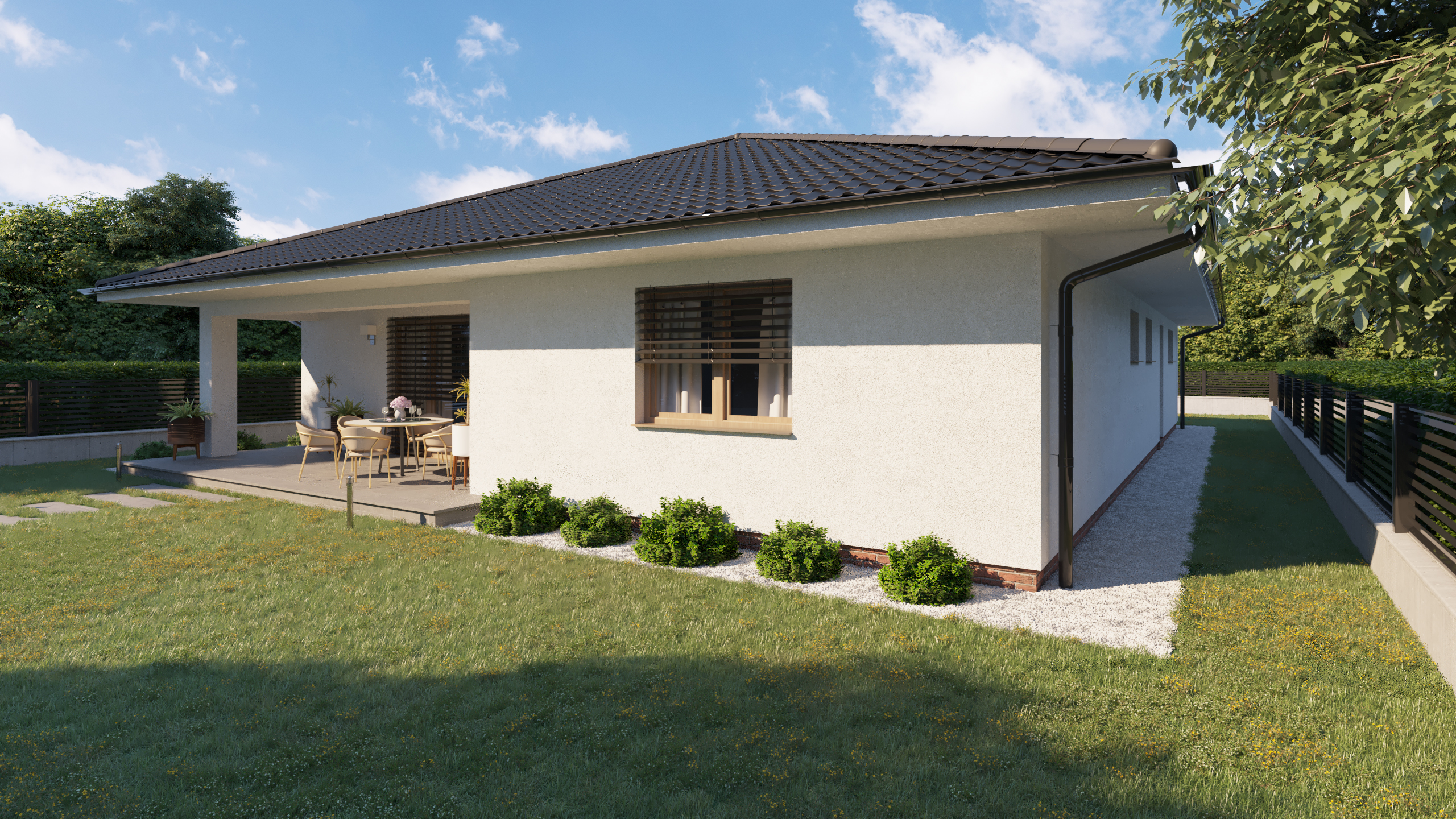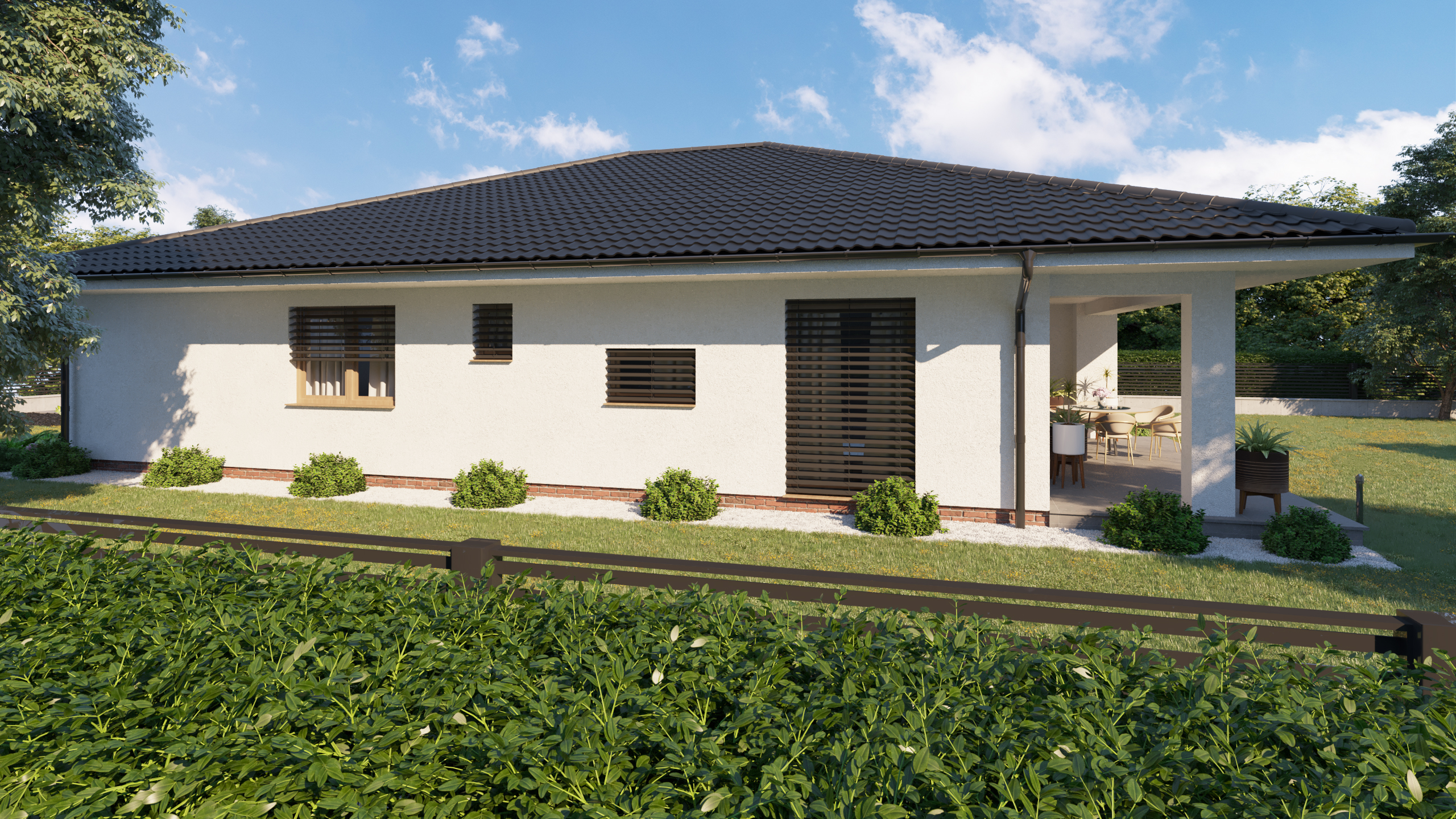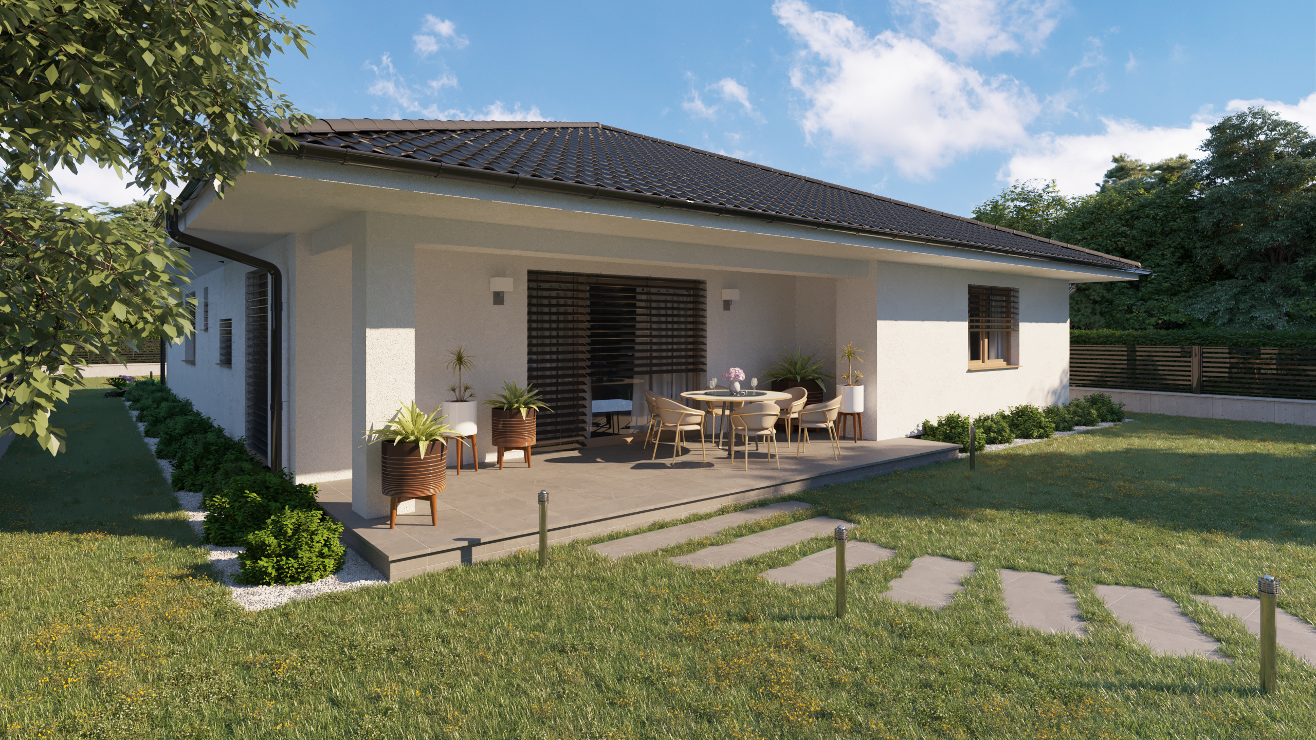 DOM PÔSOBÍ POKOJNE A PRIRODZENE ZAPADÁ DO OKOLITÉHO PROSTREDIA. KRYTÉ VSTUPNÉ ZÁDVERIE A ZÁHRADNÁ TERASA VYTVÁRAJÚ PRÍJEMNÉ PREPOJENIE MEDZI INTERIÉROM A EXTERIÉROM. HARMONICKÁ KOMBINÁCIA MATERIÁLOV PODPORUJE POCIT TEPLA DOMOVA A KOMFORTNÉHO RODINNÉHO BÝVANIA.