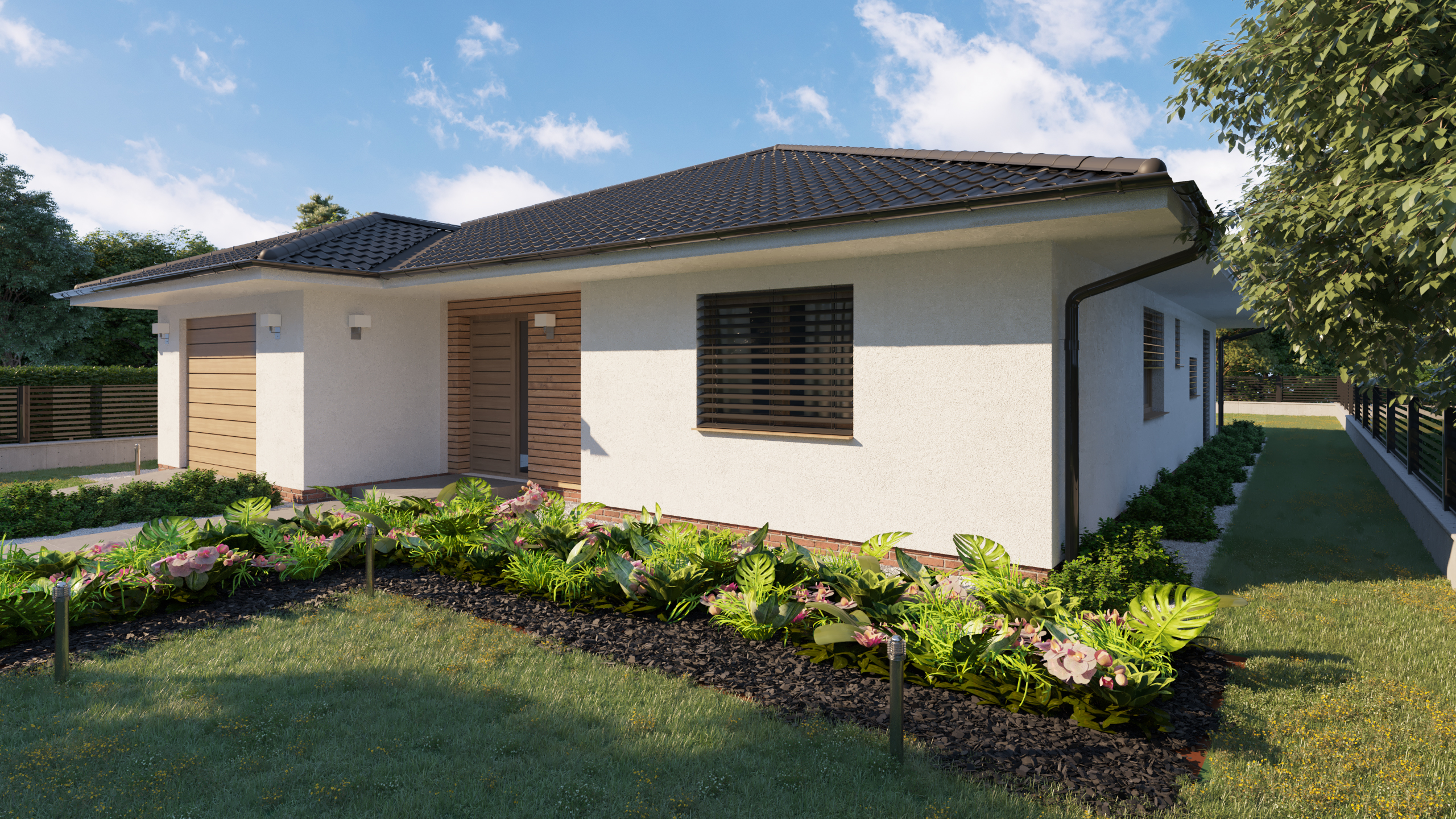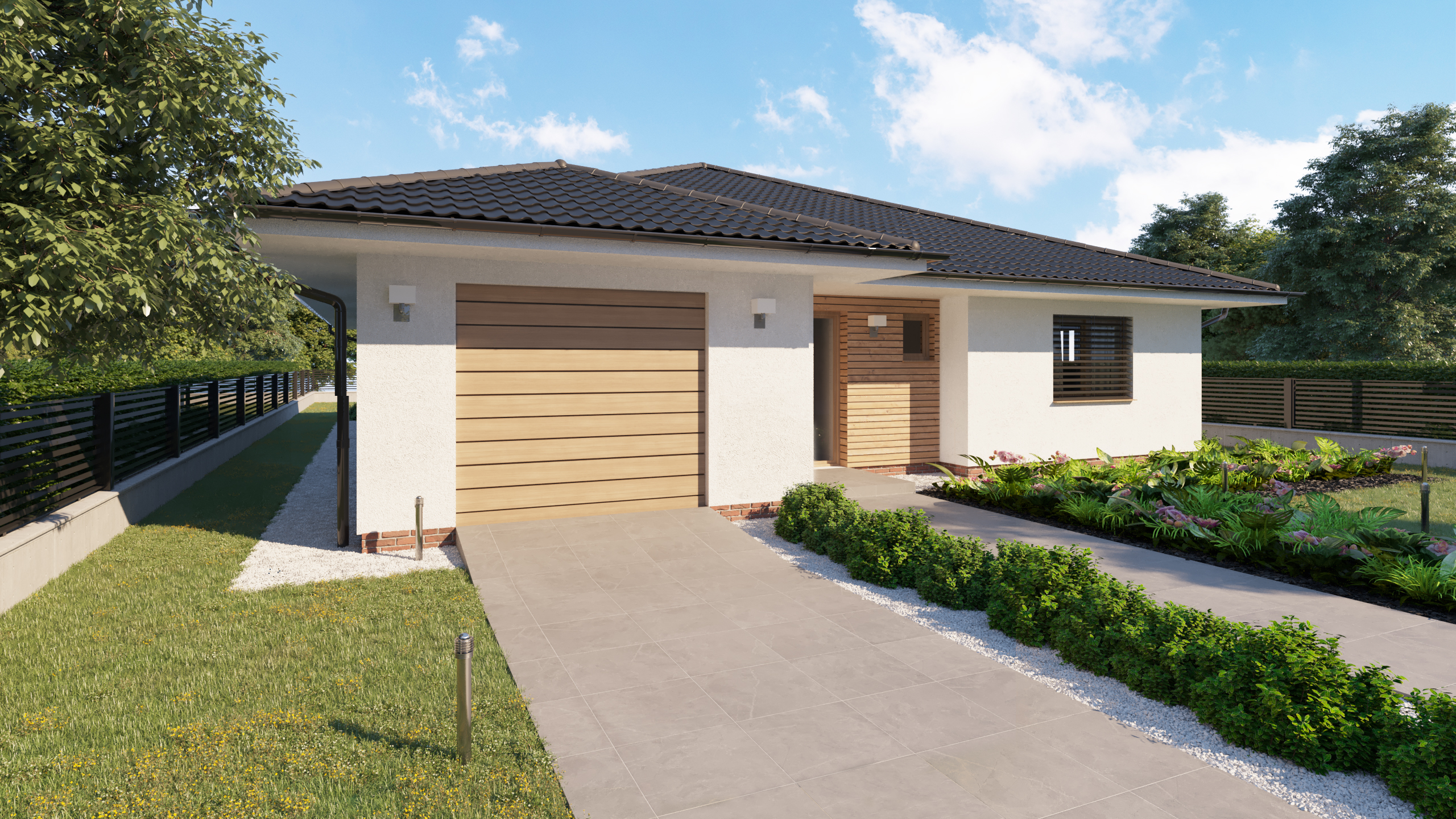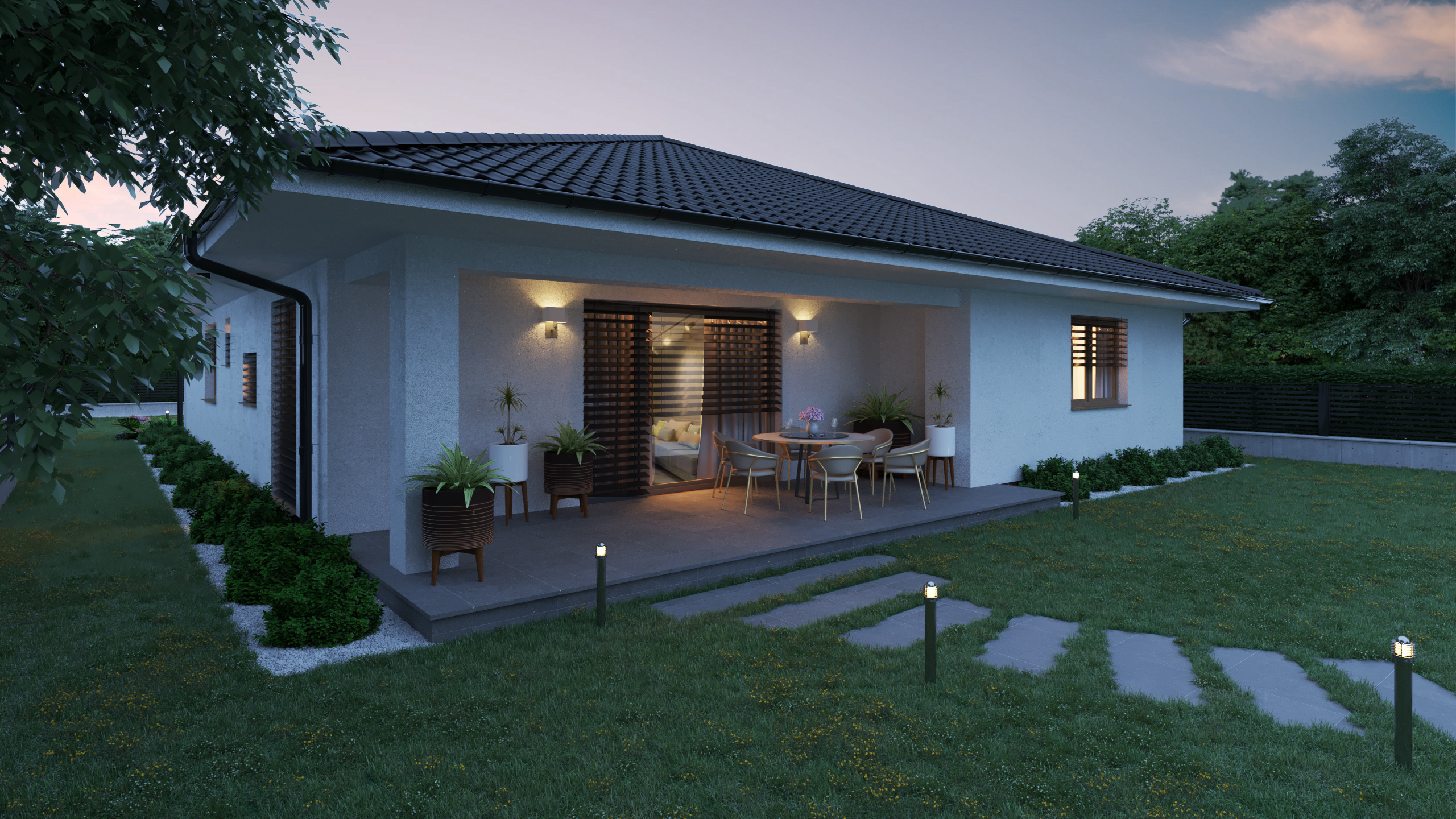 DOM PÔSOBÍ POKOJNE A PRIRODZENE ZAPADÁ DO OKOLITÉHO PROSTREDIA. KRYTÉ VSTUPNÉ ZÁDVERIE A ZÁHRADNÁ TERASA VYTVÁRAJÚ PRÍJEMNÉ PREPOJENIE MEDZI INTERIÉROM A EXTERIÉROM. HARMONICKÁ KOMBINÁCIA MATERIÁLOV PODPORUJE POCIT TEPLA DOMOVA A KOMFORTNÉHO RODINNÉHO BÝVANIA.