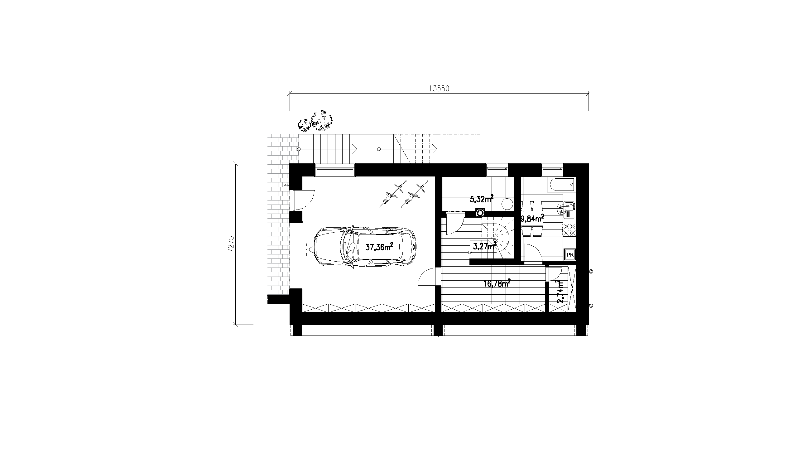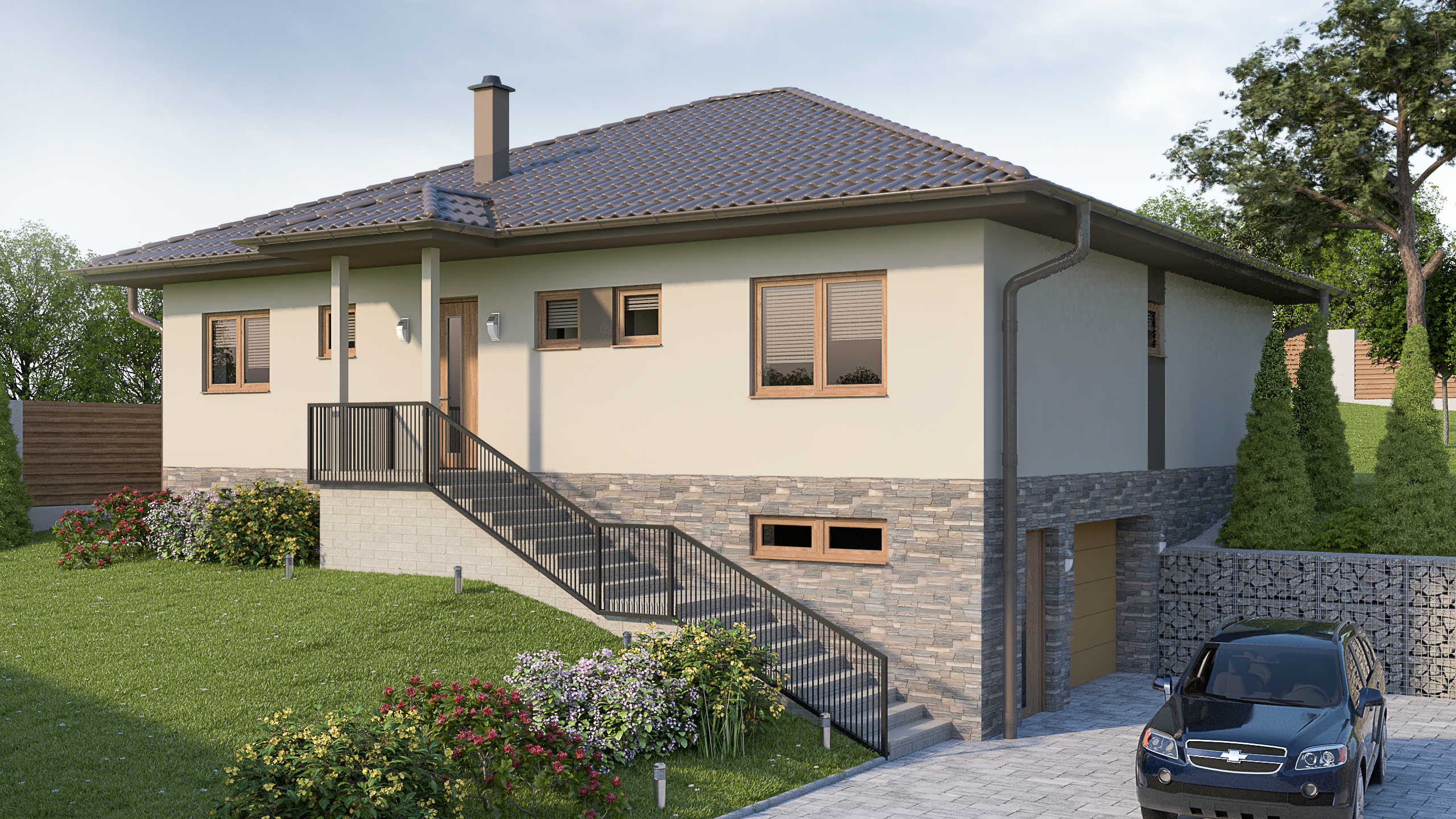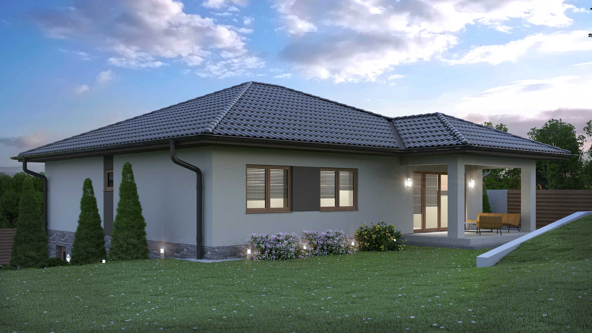 JEDNOPODLAŽNÁ STAVBA SO SUTERÉNOM JE NAVRHOVANÁ PRE 4-ČLENNÚ RODINU. SRDCOM TOHTO DOMU JE PRIESTRANNÁ A PRESVETLENÁ OBÝVACIA IZBA SPOJENÁ S TERASOU A OKOLITOU PRÍRODOU. PRÍZEMIE S HLAVNÝM VSTUPOM JE TIEŽ TVORENÉ KUCHYŇOU S JEDÁLŇOU, SÚKROMNOU ČASŤOU A HYGIENICKÝM ZÁZEMÍM. V SUTERÉNE JE SÚSTREDENÁ HOSPODÁRSKO-TECHNICKÁ ZÓNA S GARÁŽOU..
