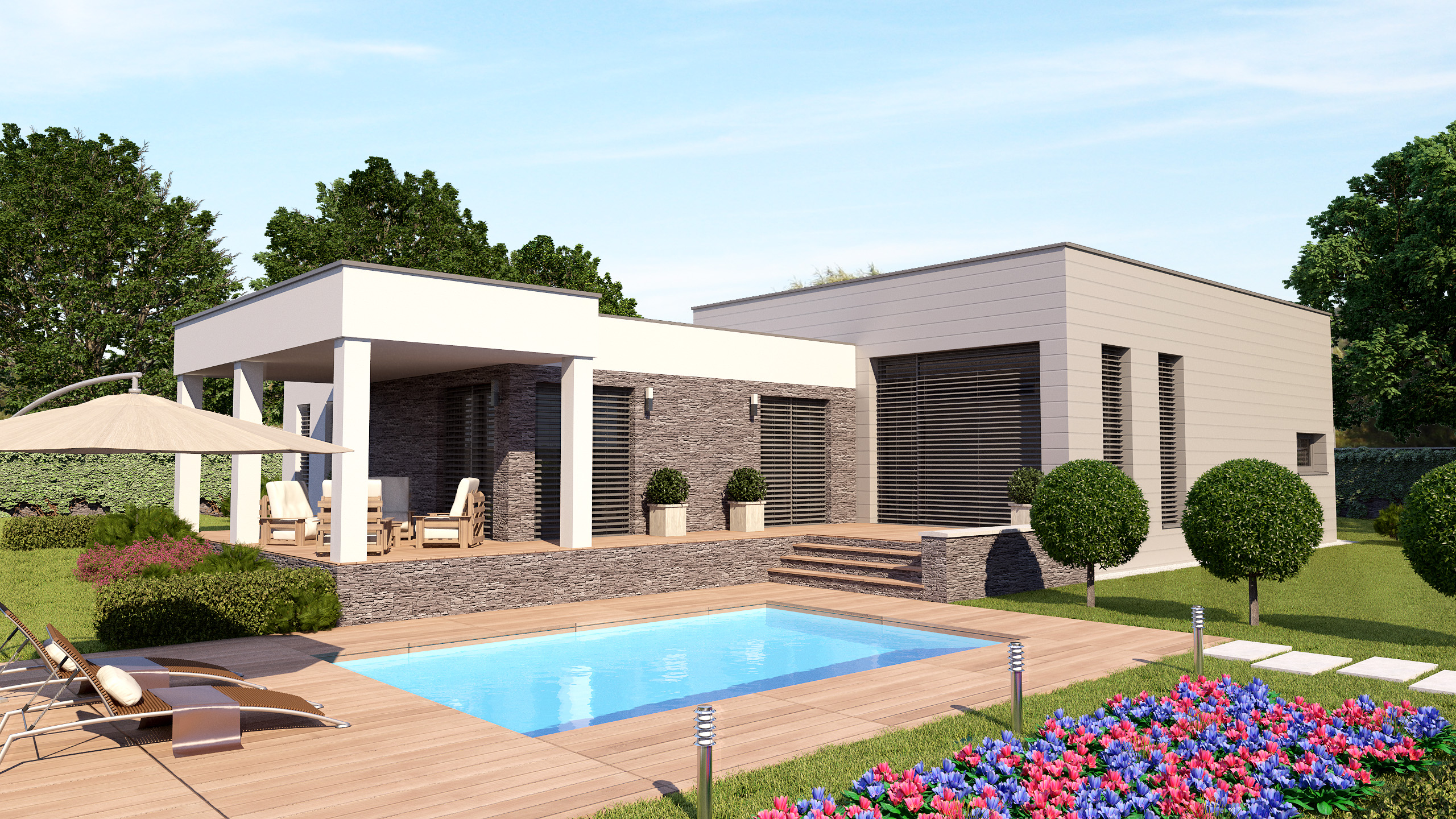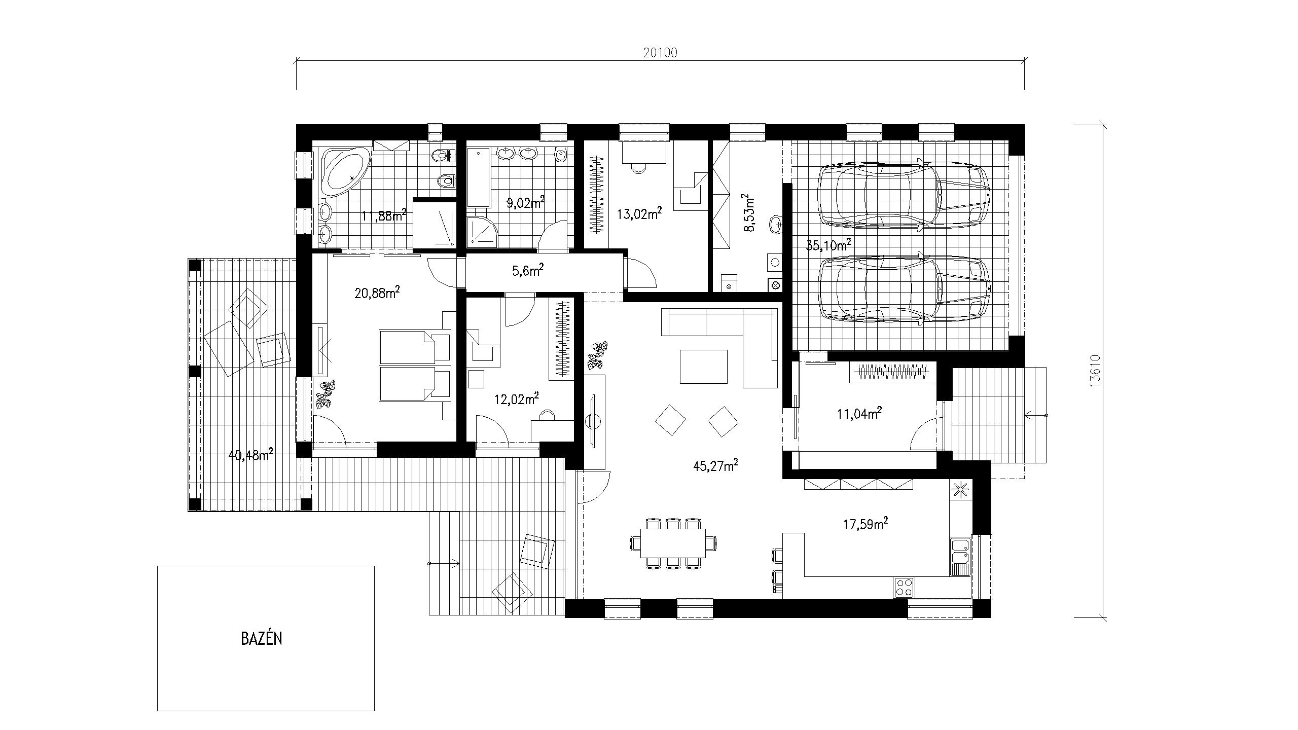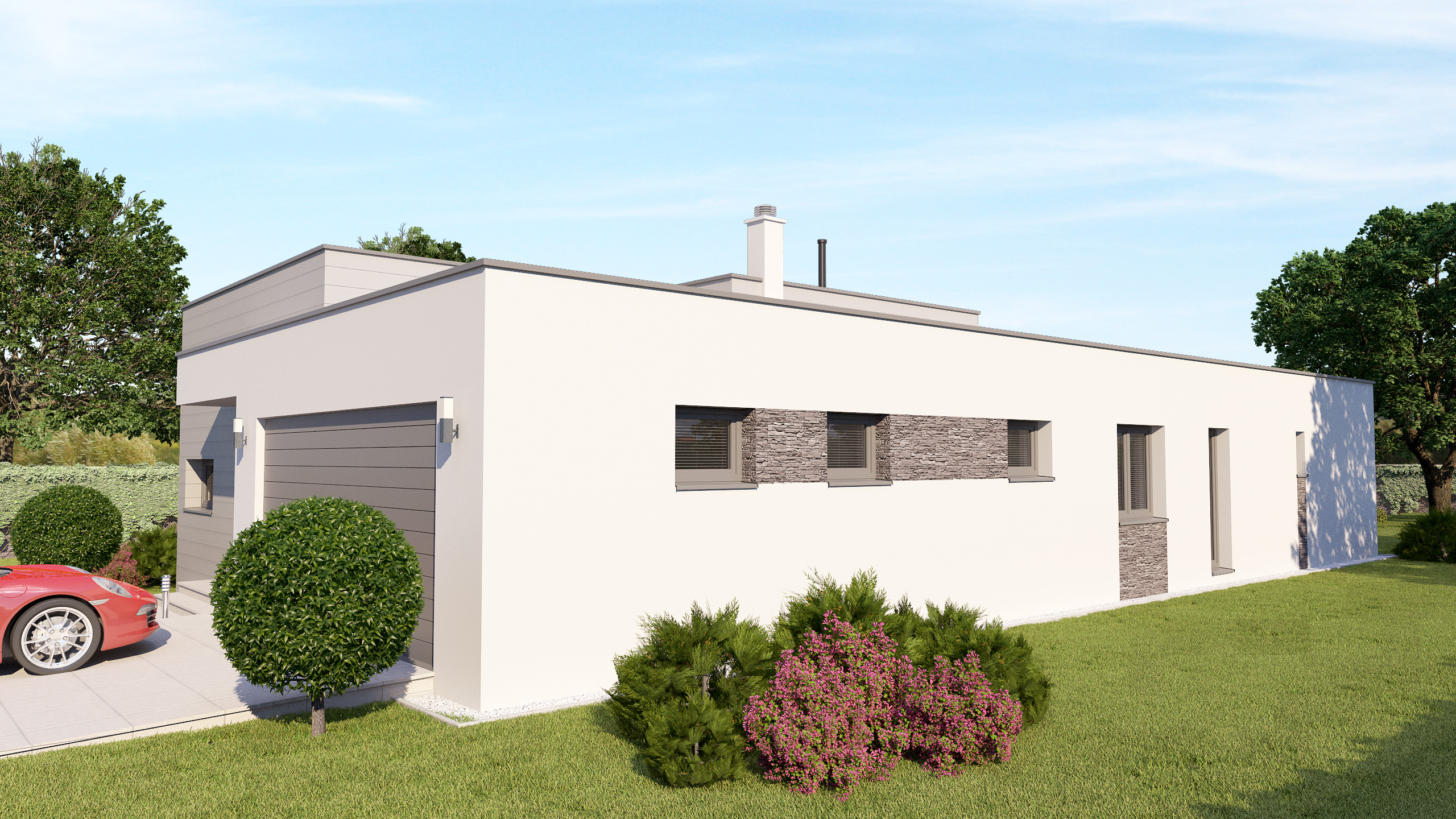 IDE O ROZĽAHLÝ RODINNÝ DOM, KTORÝ PONÚKA ŽIVÝ KONTAKT SO ZÁHRADOU. SÚČASŤOU NÁVRHU BOLA EXTERIÉROVÁ TERASA A VONKAJŠÍ BAZÉN. MODERNÝ VZHĽAD A NÍZKA VÝŠKA STAVBY PONÚKA OSADIŤ OBJEKT DO BEŽNEJ ZÁSTAVBY RODINNÝCH DOMOV.
